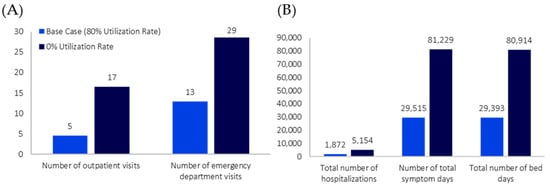 COVID-19 Model HCRU Outputs, by Varying Levels of Nirmatrelvir/Ritonavir Utilization. (A) Model outpatient and emergency department visit-related outputs by varying levels of nirmatrelvir/ritonavir utilization. (B) Model hospitalizations, total symptom dates, and bed days related outputs by varying levels of nirmatrelvir/ritonavir utilization.