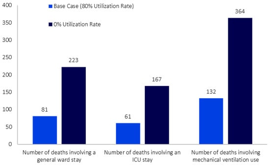 After applying the 30-day incidence to the initial model population of 23,264,640 individuals, there were 742,142 individuals with COVID-19. Of those, 150,255 patients were eligible for treatment from the Taiwanese health authority perspective; the results presented in this section focus on this subgroup of the broader population with COVID-19. Assuming a treatment utilization rate of 80% for NMV/r in the base case scenario, the total number of hospitalizations (and corresponding bed days) was 1872 (29,393 bed days), including 1179 stays (21,231 bed days) in the general ward, 356 stays (4624 bed days) in the ICU, and 337 hospitalizations (3538 bed days) involving mechanical ventilation use (Figure 2). The numbers of outpatient visits and ED visits were 5 and 13, respectively (Figure 2). The total number of symptom days was 29,515 (Figure 2). The total number of inpatient deaths was 274, including 81 deaths involving stays in the general ward, 61 deaths involving stays in the ICU, and 132 deaths involving mechanical ventilation use (Figure 3).