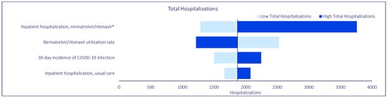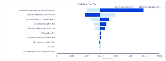 To test the robustness of the base case scenario results against potential variation in input parameters, three separate deterministic OWSAs were conducted on total inpatient hospitalizations, total bed days, and total symptom days, respectively. In the OWSA for total inpatient hospitalizations, we varied the inpatient hospitalization rate for NMV/r, the inpatient hospitalization rate for usual care, the 30-day incidence of COVID-19 infection, and the base case NMV/r utilization rate. In the OWSA for total bed days, we varied the same parameters as the analysis on total inpatient hospitalizations, as well as general ward length of stay, ICU length of stay, the rate of ICU stays, mechanical ventilation length of stay, and the rate of mechanical ventilation use. Similarly, in the OWSA for total symptom days, we varied the same parameters as the other two OWSA analyses, as well as ED visit symptom days, the rate of ED visits for NMV/r, general ward symptom days, ICU symptom days, and mechanical ventilation symptom days. Each model parameter was varied by 20% above and below the corresponding base case value, with the exception of the 30-day hospitalization rate, which was varied according to the 95% confidence intervals for NMV/r effectiveness reported in Lewnard et al. (2023) []. Only the parameters affecting hospitalizations were included in the analysis. We included the base case NMV/r utilization rate in each of our OWSAs to test the robustness of model results when assuming a utilization rate that was roughly equivalent to the midpoint of the base case and the hypothetical scenario analysis.