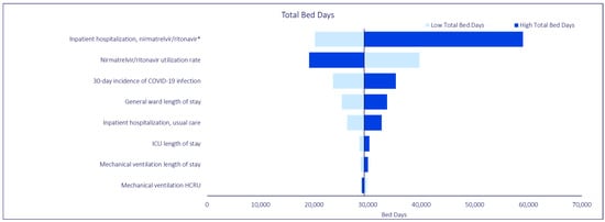 COVID-19 Model One-Way Sensitivity Analysis: Total Bed Days. * The low and high estimates were based on reported variance from Lewnard et al. []. All other parameters are varied +/−20% from base case.