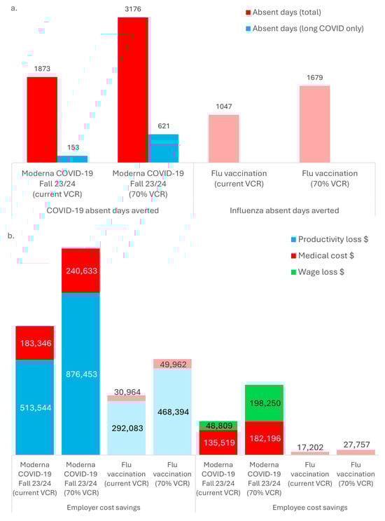 Figure 3. (a) Absent days averted; (b) Employer and employee cost savings—with Moderna COVID-19 mRNA Fall 2023/2024 and seasonal influenza vaccination versus no vaccination (N = 10,000 employees). Flu: seasonal influenza; M: million; Moderna COVID-19 Fall 23/24: Moderna COVID-19 mRNA Fall 2023/2024 vaccination; VCR: vaccination coverage rate. Note: a lighter shade is used for influenza outcomes.