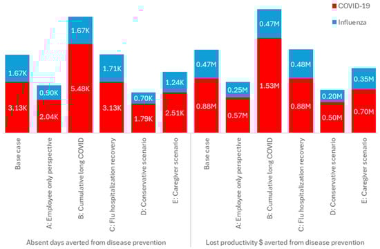 Figure 4. Vaccination impact: Impact of scenarios on absent days and lost productivity (USD) prevented by vaccination with 70% coverage Moderna COVID-19 mRNA Fall 2023/2024 and seasonal influenza workplace vaccination. Flu: seasonal influenza; K: thousand; M: million.