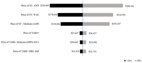 The sensitivity analysis assessed the impact of a ±10% variation in treatment duration on median prices. The price of ST exhibited a wider range of variation compared with TARE, indicating a greater sensitivity to changes in treatment duration. A 10% decrease in median OS resulted in lower costs across all pricing models, with ST declining from $218,591 (WAC) to $193,187 (Medicare ASP), and TARE from $24,496 to $23,754. A 10% increase in median OS resulted in higher total treatment costs, with ST peaking at $289,181 (AWP), while TARE remained relatively stable at $26,457 (Figure 2).
