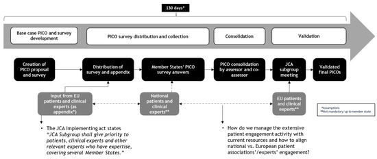 The PICO framework—defining population, intervention, comparator, and outcomes—is central to structuring the assessment of clinical evidence, guiding the formulation of research questions, and determining the evidence synthesis strategy. Within the new HTAR, patient organizations and PAGs are allocated three months to contribute to PICO scoping, first at the European level and then within national contexts (Figure 2).