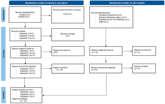 For the second phase, the authors of the paper identified three main arguments of interest: the role of cardiologists and potential partnerships, the challenges for new devices and DHTs, and the HTA diversity across Europe. For this purpose, we performed three independent searches following the revised 2020 Preferred Reporting Items for Systematic Reviews and Meta-Analyses (PRISMA) research flow. We searched for information in PubMed and Google using the same filters for the three arguments: “Free full text”, published from 1 January 2019 to 31 December 2024, and with English as document language (Figure 1).