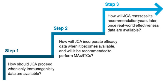 Given the potential variation in the extent of data available at the time of JCA submission, it would be beneficial for the HTACG to introduce a stepwise approach to vaccine assessment. This approach could offer different levels of guidance based on the data available at the time of submission and answer key questions (Figure 2), for example, at what stage MAs and ITCs should be conducted. This could also be supplemented by best-practice recommendations or a framework for conducting and interpreting MAs and ITCs for vaccines.
