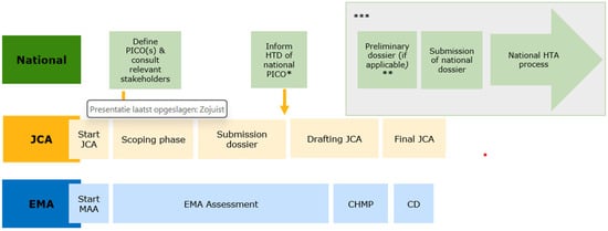The JCA process of medicinal products starts in parallel with the European Medicines Agency (EMA) process for granting marketing authorisation, leading to a timely availability of a JCA report for the national appraisal phase. The JCA focuses on the assessment of relative effectiveness and relative safety and results in a JCA report that gives a factual and objective description of this data against alternative treatment options—both pharmaceutical and non-pharmaceutical—as requested by the EU MSs. Contrary to the European process of market authorisation, reimbursement decisions will remain to be a matter of national responsibility, also under the HTAR [1]. With this JCA report as a common starting point, all MSs still have the freedom to draw their own conclusion on the therapeutic benefit of an intervention, taking into account the national context. Furthermore, they may have to perform a country-specific appraisal of the non-clinical evidence, such as cost-effectiveness, budget impact, and ethical, legal, social and organisational consequences before making the national reimbursement decision.