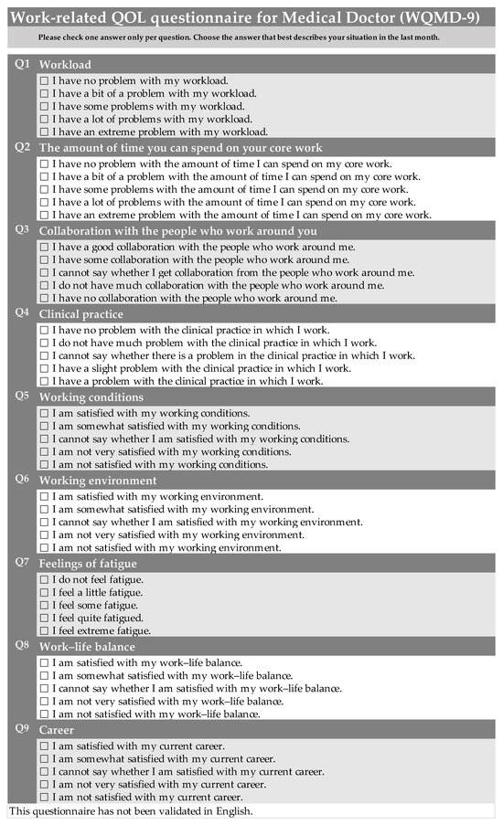 Work-related quality of life questionnaire for medical doctors (WQMD-9).