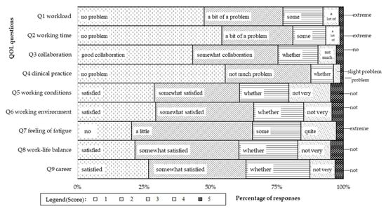 Based on consultation with the experts involved in this study and considering the results of the validation interviews, we reconstructed the questionnaire with questions on nine concepts, and the answer format was set as discrete values ranging from 1 to 5. The concept of time was divided into quantity and quality: Q1 asked about “workload” and Q2 asked about the time (“working time”) that could be spent on the core work. Q3 asked about “collaboration” with colleagues (“people who work around me”). In Q4, the “treatment” item was changed to “clinical practice.” The “infrastructure/working environment” item was changed to “working conditions” (Q5) and “working environment” (Q6). The “psychology” item was explored in Q7, and “fatigue” was replaced with the phrase “feelings of fatigue,” which combines the spiritual and physical meanings. In the “WLB” item (Q8), “choice” was changed to “satisfied,” to ensure consistency with the other questions. There was no change in the “career” item (Q9).