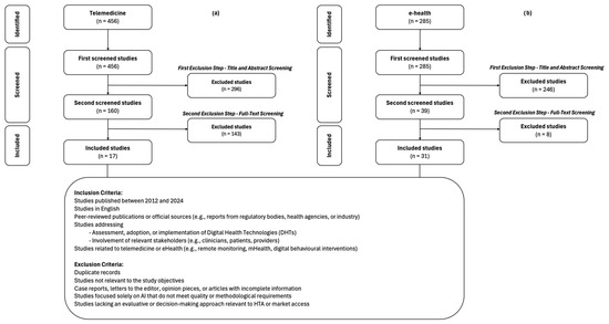 A total of 1247 studies were initially identified through the database search, which underwent a two-stage screening process. After title and abstract screening, 705 studies were excluded due to irrelevance, leaving 542 studies for full-text review. The studies were categorized into three key thematic areas: telemedicine (456 studies), eHealth (285 studies), and artificial intelligence (AI) (5 studies). However, all AI-related studies were excluded due to a lack of alignment with the study criteria, leaving a final inclusion of 17 studies for telemedicine [25,26,27,28,29,30,31,32,33,34,35,36,37,38,39,40,41] (Figure 1a) and 31 for eHealth [42,43,44,45,46,47,48,49,50,51,52,53,54,55,56,57,58,59,60,61,62,63,64,65,66,67,68,69,70,71,72] (Figure 1b). The five studies identified in the field of AI were excluded as they did not provide relevant evidence in relation to the specific objective of this study: the identification of factors acting as barriers or facilitators in the development, implementation, and market access of DHTs by developers. In particular, the AI studies analyzed were primarily focused on technical or clinical aspects (e.g., diagnostic accuracy, algorithmic performance), without delving into the regulatory, economic, or systemic context implications that influence development and commercialization decisions.