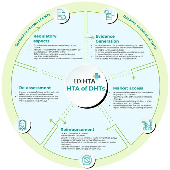 Strongly resonating with the results of the literature review, developers validated the need for broader stakeholder engagement throughout the HTA process, from development to post-market surveillance. This involvement would help ensure that DHTs meet real-world clinical needs and align with existing care pathways. Telemedicine developers highlighted the benefits of early clinician involvement in usability testing, which improved integration into healthcare settings and adoption rates. These perspectives not only highlight challenges across the lifecycle of digital health technologies but also point to broader limitations in current HTA practices, which are further explored in the following discussion. Key challenges and barriers for developers are summarized in Figure 2.