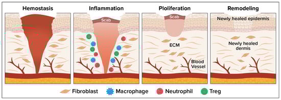The wound healing process consists of four overlapping but distinct phases: (1) hemostasis, which involves vascular constriction and platelet aggregation leading to clot formation; (2) inflammation, allowing pathogens and debris to be removed; (3) tissue regeneration, involving fibroblast proliferation, angiogenesis, and keratinocyte migration to re-epithelialize the wound; and (4) remodeling or maturation when the tissue is reorganized and strengthened [1]. Figure 1 depicts the wound healing process. Wound infection disrupts the normal healing process, often leading to chronic wounds, delayed closure, or systemic complications. Bacterial colonization leads to biofilm formation. Infected wounds show excessive neutrophilic infiltration, increased reactive oxygen species, protease release, and cytokine dysregulation. Chronic inflammation leads to tissue necrosis, fibrosis, and persistent non-healing states [2].