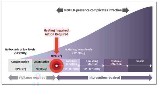 The Wound Infection Continuum. When wound bacterial loads exceed 104 colony-forming units per gram (CFU/g), intervention is needed to handle biofilm and deter serious infection from occurring [12].