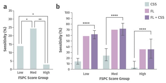 Sensitivity for detecting a high load of bacteria with (a) clinical signs and symptoms (CSS) alone and (b) CSS alone vs. fluorescence imaging (FLI) alone vs. CSS in combination with FLI for groups of patients with low, medium, and high Fitzpatrick Skin Phototype Classification (FSPC) scores [76]. Statistically significant at p < 0.05 (*), p < 0.01 (**), or p < 0.0001 (****).