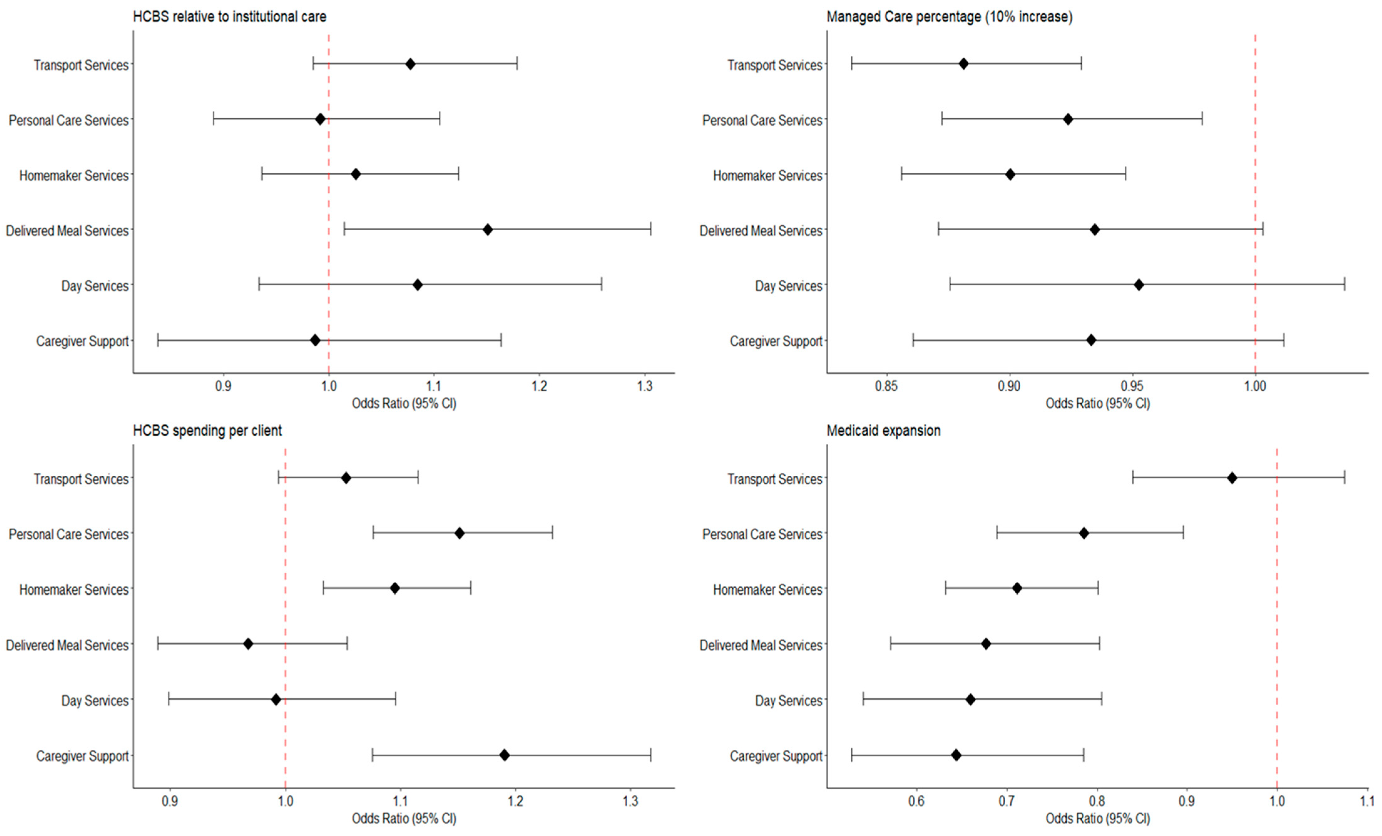 HCBS spending relative to institutional care spending | 1.19 (1.11, 1.28) *** |