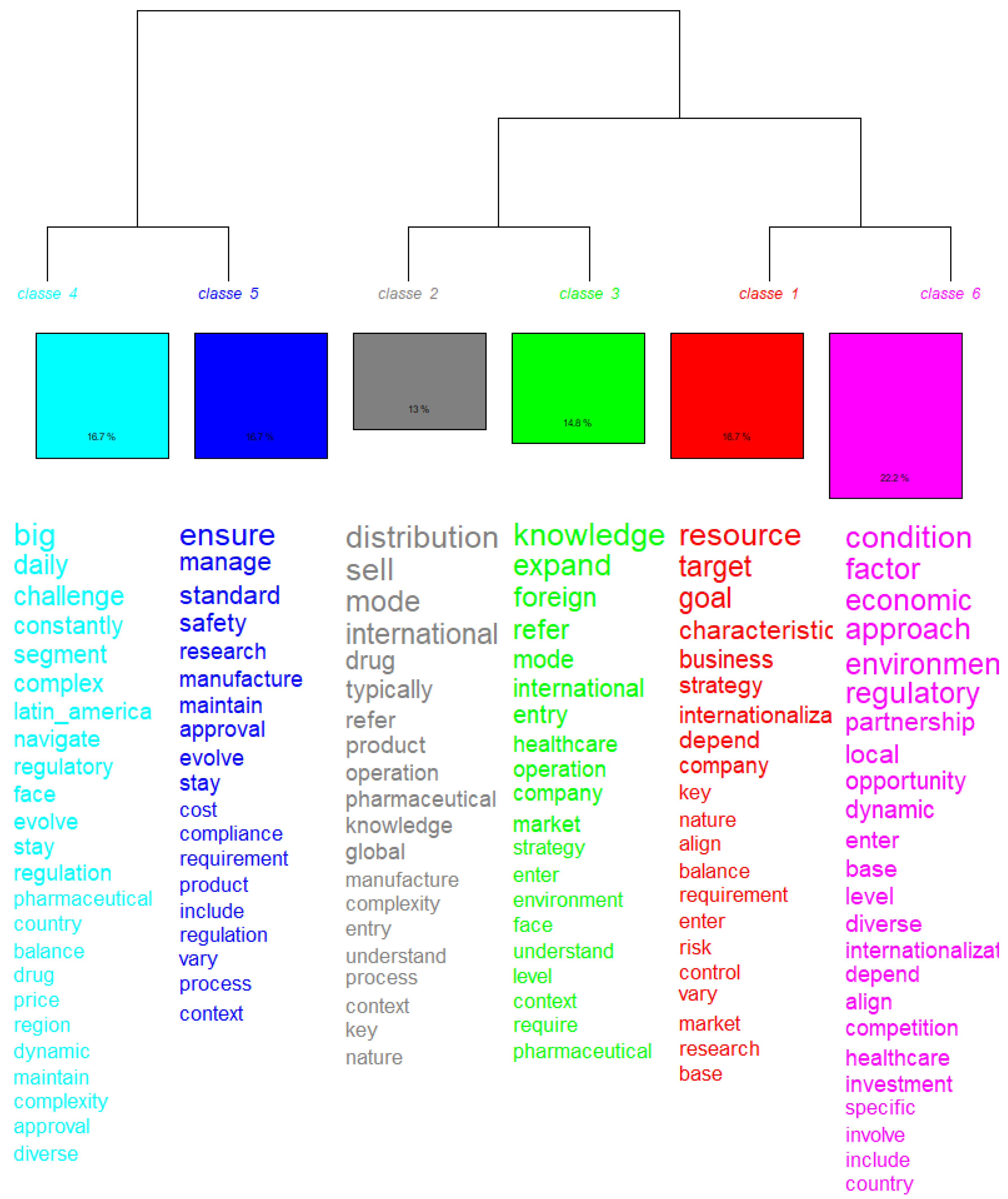 It comprises 16.7% (f = 6 ST) of the total corpus analyzed. This class is composed of words such as “big” (χ2 = 37.8); “challenge” (χ2 = 21.6); “regulatory” (χ2 = 5934); “pharmaceutical” (χ2 = 3506); and “complexity” (χ2 = 635)