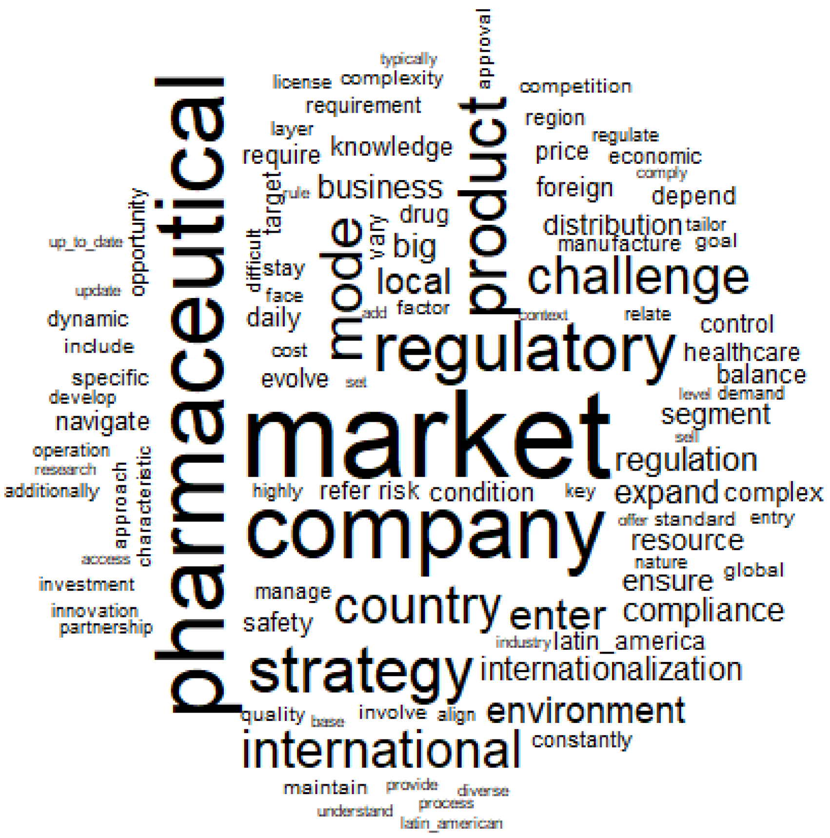 Figure 4 is a visual representation of the most frequent words in the analyzed corpus. The most evoked words were “market” (f = 66), “pharmaceutical” (f = 50), “company” (f = 46), and “regulatory” (f = 35).