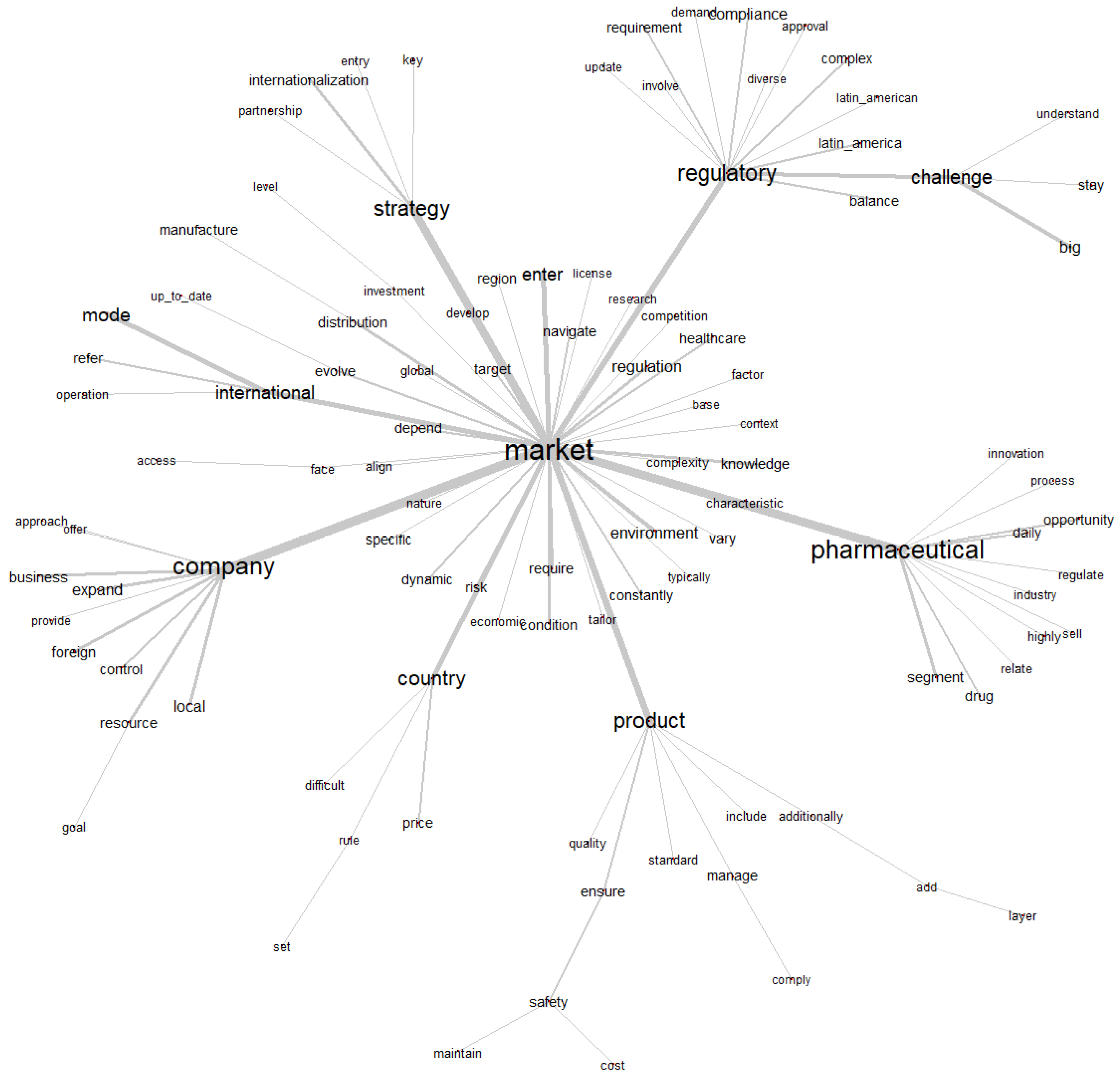 These larger words indicate the central themes of the corpus: pharmaceutical market, companies, regulation and international strategies.