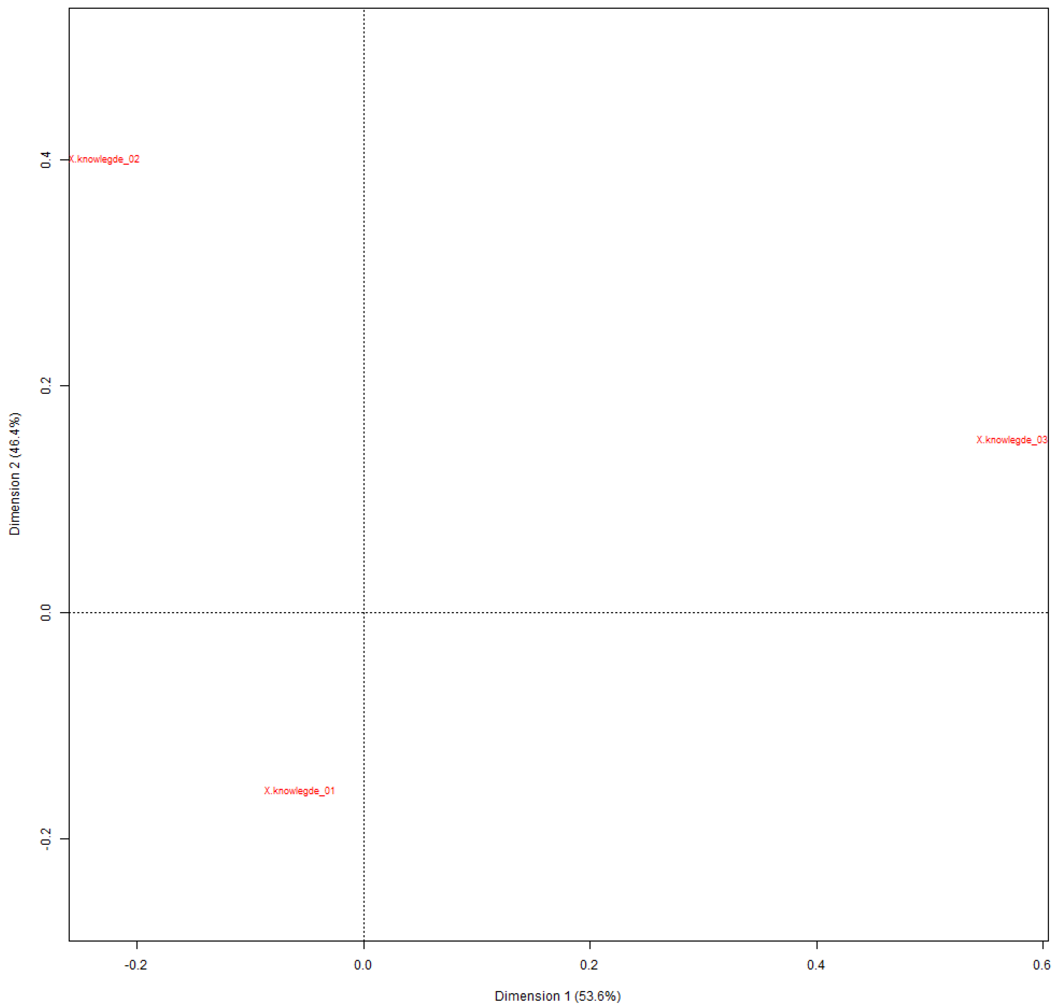 Figure 7) describe the dimensions, where Factor 1 (horizontal axis) explains 53.64% of the variance, Factor 2 (vertical axis) explains 46.36% of the variance, and the total variance explained is 100% (53.64% + 46.36%).