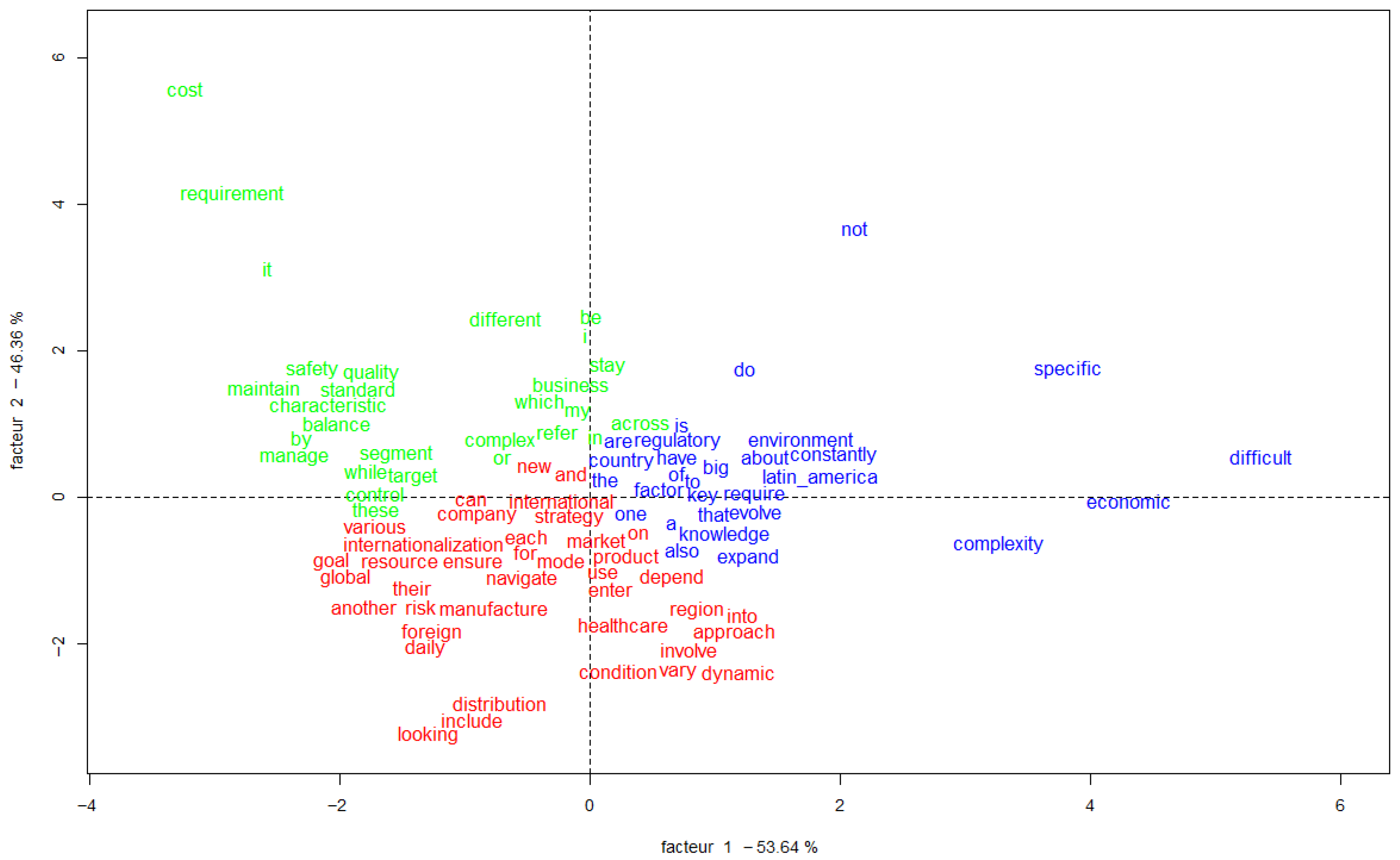 It comprises 14,8% (f = 6 ST) of the total corpus analyzed. This class is composed of words such as “knowledge” (χ2 = 16,921); “expand” (χ2 = 15,135); “foreign” (χ2 = 11,418); and “market” (χ2 = 2683).