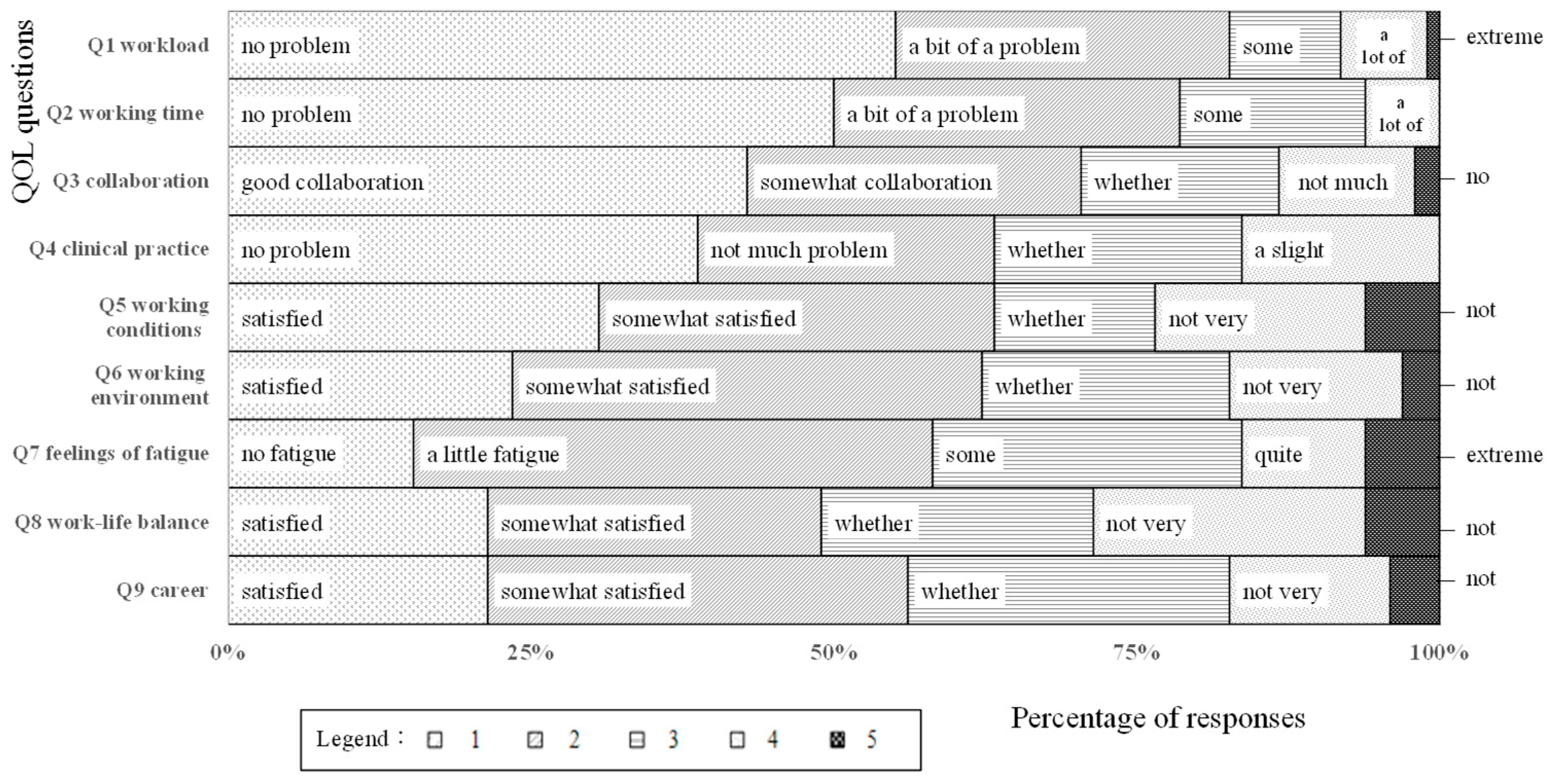 | Q1 Workload | Q2 Working Time | Q3 Collaboration | Q4 Clinical Practice | Q5 Working Conditions | Q6 Working Environment | Q7 Feelings of Fatigue | Q8 Work-Life Balance | Q9 Career | QOL VAS | |