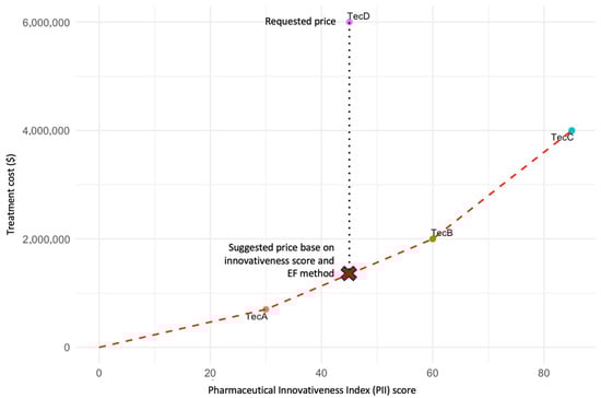 EF based on the PII. The figure illustrates an EF constructed using the PII score (x-axis) and the regulated price (y-axis) for three existing technologies (TecA, TecB, and TecC) and a new technology (D) under evaluation. Each point represents the relationship between the degree of innovativeness and the approved market price. The red dashed line represents the efficiency frontier connecting existing technologies. The vertical dotted line indicates the price requested by the manufacturer for TecD. The red “X” denotes the suggested price for TecD based on its PII score and the EF method. The proposed price for technology D should correspond to the position on the EF between technologies A and B, reflecting its relative innovativeness as measured by the PII. This approach ensures consistency and equity in price determination by linking incremental innovation to economic value. Note: This figure is illustrative and does not depict real data. It was developed to demonstrate the conceptual use of the PII as a quantitative metric within efficiency frontier modeling.
