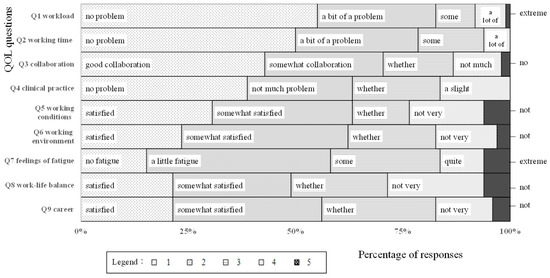 Objective: This confirmatory survey aimed to verify the criterion-related validity and reliability of the final version of the Medical Doctors’ Work-Related Quality of Life Questionnaire (WQMD-9), following partial revision of its content. This study also explored the questionnaire’s structure and scoring methods. Method: From June to July 2022, the WQMD-9 was administered to 98 MDs selected to match the statistical distribution of MDs in Japan. Criterion-related validity was evaluated using a visual analogue scale (VAS) as the reference standard, and reliability was examined using inter-dimension correlations and Cronbach’s α. Results: The correlation coefficient between the VAS score and the simple sum of WQMD-9 dimensions scores was 0.7891, supporting criterion-related validity. Cronbach’s α was 0.87, indicating acceptable reliability. Conclusions: The profile-type WQMD-9 consists of nine dimensions—“Workload,” “Working time,” “Collaboration,” “Clinical practice,” “Working conditions,” “Working environment,” “Feelings of fatigue,” “Work-life balance,” and “Career”—with five levels. In the confirmatory survey population, the WQMD-9 demonstrated criterion-related validity and reliability, suggesting that it can be utilized with simple total scoring approach. Full article