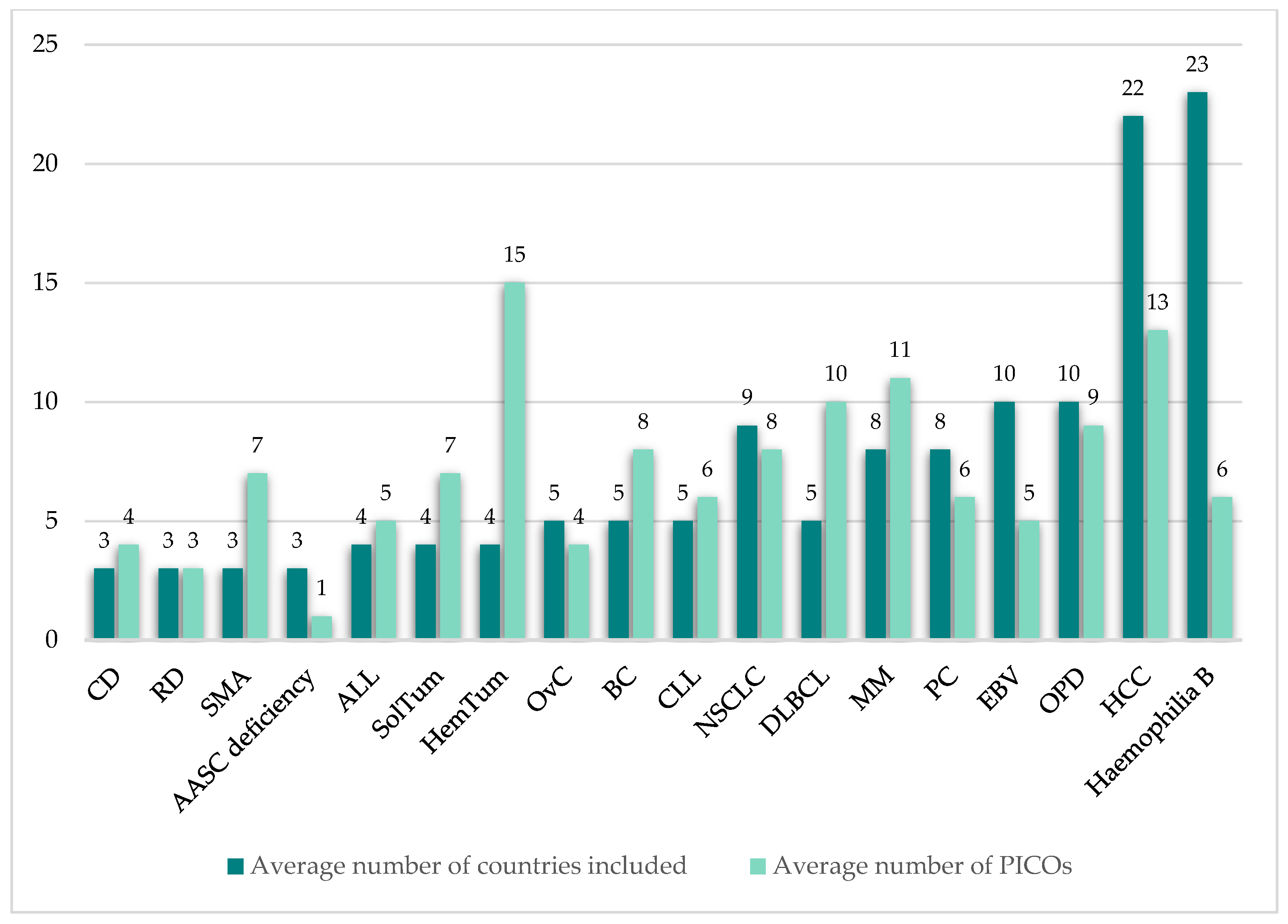 - Ecker, T.; Barz, V.; Redmond, S.; Zacho, J.; Ertl, A.; Theuillon, T.; Martin, A.A.; Vansieleghem, S.; Seweryn, M.; Lidonnici, D.; et al. Challenges of the PICO scoping process: How does the number of involved member states impact results? Value Health 2024, 27, S418–S419. [Google Scholar] [CrossRef]