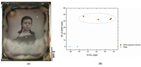 Very few examples have been reported in the literature on pigment mixtures [17,22], so their investigation is particularly interesting. In this respect, a crayon daguerreotype (DVQ-F-000761) (Figure 5a) was examined. Crayon daguerreotypes, patented in 1849 by Whipple in the USA, imitate crayonist portraits by restricting the image to the head of the sitter thanks to the white areas obtained by positioning, in front of the camera, screens with an aperture in the center and moving them during the sitting session. However, in some cases, as for the daguerreotype DVQ-F-000761, the same effect was imitated by applying white pigments.