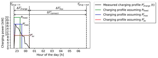 - Fixed constant charging power, [kW], which can be chosen depending on the type of car or the type of charging station. The charging duration for this fixed constant charging power profile is , which is calculated using Equation (4).