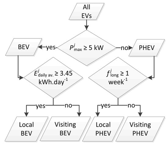 First, the EV IDs are split into two main categories, namely BEVs and PHEVs. This is done because charging behavior is different between these types of EVs and because the share of BEVs in the total EV fleet is expected to grow in the future [28]. The division between BEVs and PHEVs is based on the maximum charging power at which each EV j charged during the measurement period ( [kW]). For the top five best sold PHEVs in the Netherlands, which cover 66% of the total number of Dutch PHEVs, the maximum charging power is 3.7 kW [1,29]. Therefore, an EV is considered a BEV if ≥ 5 kW and a PHEV if < 5 kW. Further, as EVs owned by people living in the area were expected to charge more frequently and have longer connection times, a division between local and visiting EVs is made. A BEV is considered to be local (i.e., owned by residents) if its average daily charging demand ( [kWh·EV−1·day−1]), averaged over the year, exceeds a certain threshold. The demarcation is set at 3.45 kWh·day−1, which is 50% of the average daily energy demand of a Dutch electric passenger car, based on an average daily distance of 34.6 km [30,31] and a driving efficiency of 5 km·kWh−1 [32]. This assumption was found to yield meaningful results (see Section 4.1). For PHEVs, is less informative as the share of electricity demand in their total energy demand is unknown. Therefore, for PHEVs, the frequency of long transactions ( [week−1]) is used as a decision parameter, in which a long transaction was defined as a transaction with a connection duration of over 6 h. The division of EVs is illustrated in Figure 2. Using this division, the available flexibility can also be expressed per EV category by selecting only transactions by EVs from a certain category.
