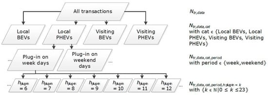 For these reasons, the measured transactions are split into different subsets. The first division is made based on the EV categories, resulting in four sets with size , as depicted in Figure 3. Then, these sets are divided into transactions during the week and transactions during the weekends. Each of these eight sets has size (see Figure 3). To take into account the variation of transaction properties with the time of the day, each of the 8 sets with size is further split into 24 sets based on starting hour of the transaction, resulting in 8 groups of 24 sets, each containing a number of transactions equal to (the bottom row of Figure 3). The distributions of and in each of these sets were tested on similarity with the distributions in the other 23 sets from the same group, that is, using a non-parametric two-sample Kolmogorov–Smirnov test [35,36]. The set with size is considered similar to another set if the frequency distributions of both and showed no significant (p ≤ 0.05) differences between the two compared sets. This way, each set with size is associated with similar sets in the same group.