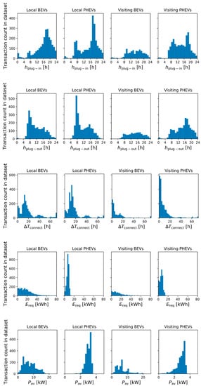 To shed more light on the distributions of the transaction parameters in this case study, Figure 4 shows histograms of key parameters for the different EV categories. The normality of these distributions was tested using the Shapiro–Wilk test; the test results showed that none of the distributions in Figure 4 follow a normal distribution (p-values << 0.001). The upper histograms show the distribution of over the hours of the day for EVs in the different categories, illustrating that local BEVs tend to plug in mostly in the evening, while the histogram for local PHEVs shows peaks in the evening as well as in the morning. This indicates that the local PHEV category also includes EVs from commuters that are working in the area and thus were not excluded by the selection criteria used in this study (see Figure 2). For visiting EVs, the arrival times are more evenly distributed over the period between 08:00 and 00:00. The distributions of , depicted in the second row of Figure 4, show that local BEVs mostly leave in the morning, whereas local PHEVs plug out mostly in the mornings or the early evenings. The third row in Figure 4 shows connection durations There is a cut-off in measured connection durations at 72 h: to transactions with h, a of 72 h is assigned. As expected, local EVs show longer connection durations than visiting EVs. For local BEVs, is frequently between 0 and 4 h or 12 and 14 h, while local PHEVs are most often plugged in during a period of 10–16 h. For visiting BEVs and PHEVs, values for below 2 h are most common. The fourth row of Figure 4 shows the distributions of [kWh]. The distribution for local BEVs shows a decreasing number of transactions for increasing values of , with a maximum of 60 kWh. One outlier, 105 kWh, is not included in the graph for reasons of clarity. For both local and visiting PHEVs, is often lower, showing a maximum of 22 kWh due to the criteria presented in Section 2.2. The bottom row in Figure 4 depicts the histograms for the transaction-specific average charging power (see Equation (6)). The measured transaction-specific average charging power varies largely between EV categories and between transactions within each EV category, especially for BEVs.