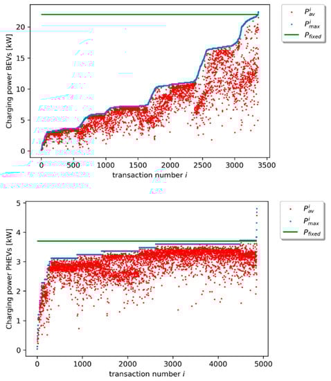 Analysis of the measured charging power profiles per transaction for BEVs (top) and PHEVs (bottom). For each transaction i, two points are plotted: a red one depicting , and a blue one depicting . The transactions are sorted in order of increasing . The green line shows the value of (see Section 2.1).
