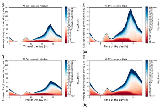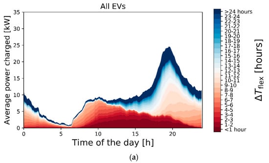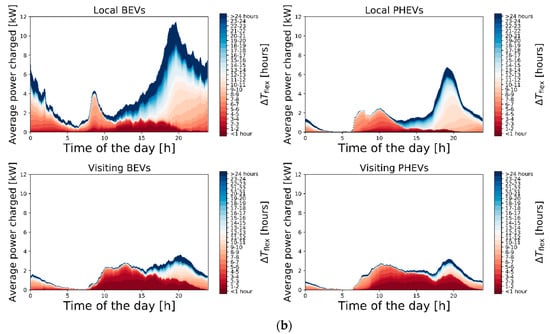 In order to assess the time-dependent flexibility of the EV demand, of each measured transaction i is linked to , after which the demand is aggregated, as described in Section 2.1. In Figure 6, the aggregated EV demand is averaged over the whole dataset for each time of the day with 5 min resolution. Figure 6a represents the time-dependent flexibility of the aggregated demand of all EVs in the dataset. In Figure 6b, the time-dependent flexibility is presented per EV category. The different colors indicate the possible [h] for different parts of the average measured aggregated EV demand at each time of the day. Note that was defined as the number of hours over which the demand could be shifted within the connection duration of an EV (see Figure 1). The results show that, given this maximum available flexibility, there are ample opportunities to shift the EV demand over time given the present-day plug-in and -out times and measured charging profiles. For all EVs together (Figure 6a), 59% of the aggregated EV demand can be delayed for more than 8 h, 25% over more than 16 h, and 16% even more than 24 h. This suggests that there is sufficient flexibility available to charge part of the EVs during the PV generation peak of the next day. This could increase local PV self-consumption and alleviate generation congestion. For both local BEVs and local PHEVs (upper row in Figure 6b), we see a clear peak in evening demand that shows a relatively high flexibility in comparison with other moments during the day. In contrast, the average demand profiles of the visiting EVs show both less pronounced peaks and reduced flexibility. Local BEVs have highest impact on the evening peak, but also show the highest flexibility. The difference between BEVs and PHEVs is mainly in the height of the evening peak of the aggregated charging profile, while the shape of the average daily charging profiles is similar between BEV and PHEVs.
