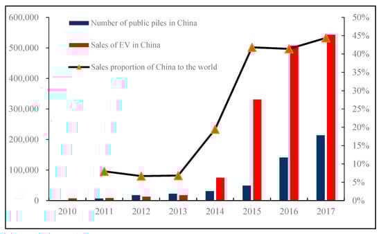 Electric vehicles (EVs) have been considered a promising technology for mitigating greenhouse gas (GHG) emissions, which have attracted the attention of countries all over the world [1,2]. In 2017, the global market share of new energy vehicles exceeded 1 million on the road. As the largest market of electric cars in terms of sales share, China has sold 556,000 electric cars, accounting for 50% globally [3]. As an essential component of supply infrastructure, public charge piles totaled 214,000 in 2017, as shown in Figure 1. However, it is worth noting that the imbalance of demand–supply in electric vehicle charging infrastructure (EVCI) and low charging service have become the prominent obstacles to sustainable development of EVs in China [4]. To deal with the issues mentioned, the public–private partnership (PPP) model has been introduced in EVCI projects to satisfy increasingly urgent charging demand by attracting private sectors to participant in electric vehicle charging infrastructure public–private partnership projects (EVCI-PPPs) [5,6]. EVCI-PPPs have the following advantages: (1) they release the government’s financial pressure and management pressure; (2) they make use of the private sectors’ strengths in financing, construction, operation, and management; and (3) they provide satisfactory, efficient, and diverse charging services, which are beneficial to promote the sustainable development of EVs and EVCI projects.