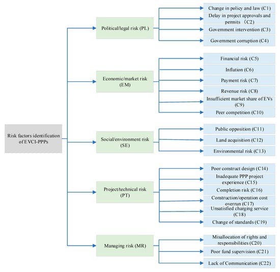 EVCI-PPP projects are recognized as risky investments and are characterized by large initial investment, administrative difficulties, low charge utilization, and poor charge efficiency. From literature reviews, the risk factors of EVCI-PPP projects are identified, which includes 22 risk factors from 5 dimensions (see Figure 2), presented below.