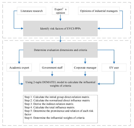 In general, DEMATEL is an effective tool to handle barriers and risk elements. 2-tuple can effectively retain expert evaluation information and reduce information loss in processing expert linguistic decisions. Moreover, the combined method of 2-tuple and DEMATEL has no loss of evaluation information when computing with linguistic terms, which can deal with complex problems and establish visualization of a cause–effect diagram. Therefore, this paper develops the model based on the 2-tuple fuzzy linguistic representation model and DEMATEL model to identify and analyze the risk factors of EVCI-PPP projects, obtain the weights of each criterion, classify important criteria into cause and effect groups, and depict the cause–effect diagram to visualize the influence interrelationships among risk factors.