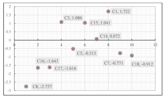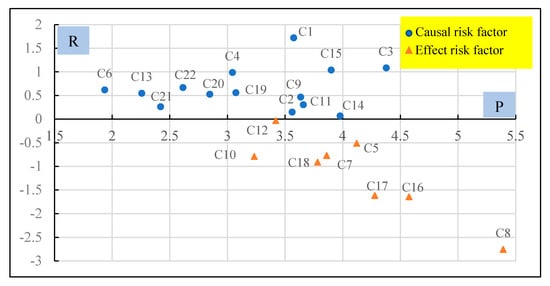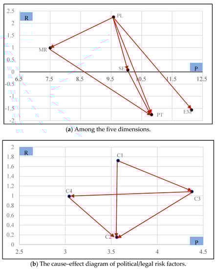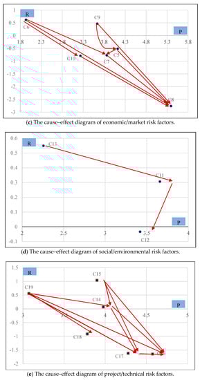 On the basis of prominence , horizontal axis, and relation vertical axis, , a cause–effect diagram can be constructed to visualize the importance and classification of overall risk criteria. According to this cause–effect diagram, the government and private decision makers could take target measures to control EVCI-PPP projects’ risk.