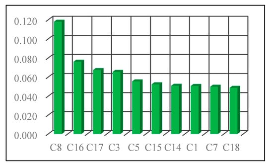 In this step, the influence degree —the sum of rows—and the degree of being influenced —the sum of columns—can be determined based on Equations (10) and (11).