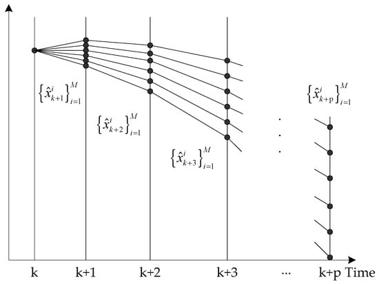 Then the Gauss distribution is sampled by the Monte Carlo method, and all the M particles are sorted from large to small to obtain set . Then the M input vectors are established, and the next Gaussian mixture distribution is obtained by the input prediction model.