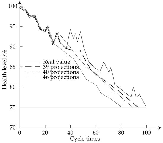 The algorithm cannot effectively predict the change of SOH but has a good adaptability to the change of the actual value. Tests were conducted during four different periods, as shown in Figure 4 and Table 4. During the mid-cycle life, the measured value of the capacity of the No. 4 lithium battery changed sharply during the 40th cycle and 46th cycle, resulting in a sharp rise (i.e., a sharp change) of SOH value. In the 65th cycle and the 75th cycle, the measurements of the capacity of the No. 4 lithium battery showed wavelet changes, and the SOH value increased slightly. The prediction error of the cycle life of the No. 4 lithium battery during this period was large, with the prediction starting point being 39 times, 40 times and 46 times. Fitting linear attenuation curves before and after the change point are shown in Figure 4 and Table 5. The health level represents the surplus usage of the battery.