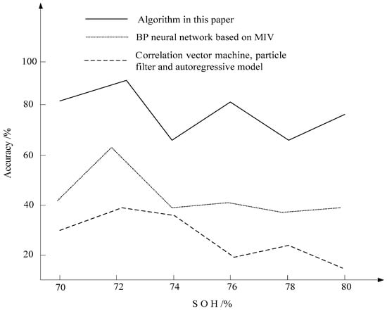 Figure 7 shows that when SOH is 70, the accuracy of the proposed algorithm, the prediction algorithm based on the MIV BP neural network and the algorithm based on the correlation vector machine particle filter and autoregressive model are 82%, 42% and 30%, respectively. When SOH is 76%, the accuracy of the proposed algorithm, the prediction algorithm based on the MIV BP neural network and the algorithm based on the correlation vector machine particle filter and autoregressive model are 84%, 43% and 20%, respectively. When SOH is 80%, the accuracy of this algorithm, the prediction algorithm based on the MIV BP neural network and the algorithm based on the correlation vector machine particle filter and autoregressive model are 82%, 42% and 18% respectively. It can be concluded that the accuracy of the proposed algorithm has a higher prediction accuracy and stable prediction performance compared with the other two algorithms.