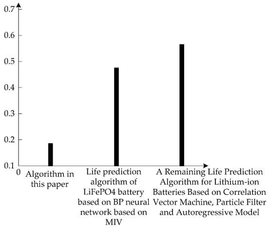 Aging is usually predicted to accelerate between 70% and 80% SOH. In this study, the prediction accuracy of the LiFePO4 battery life prediction algorithm based on the MIV BP neural network was compared with that of the Lithium ion battery life prediction algorithm based on the correlation vector machine particle filter and autoregressive model when the cycle life of a lithium battery occurs between 70% and 80% SOH, as shown in Figure 7.