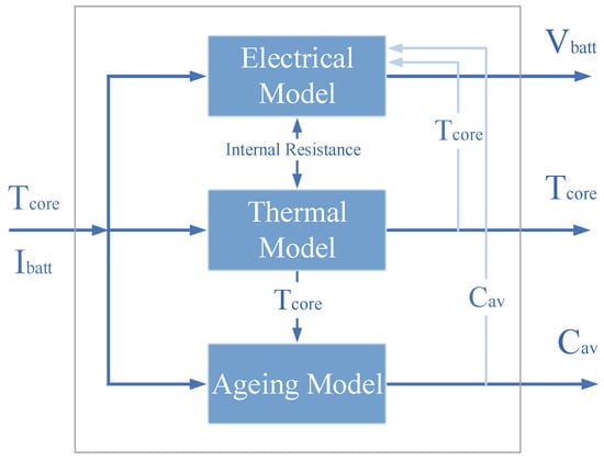 In this paper, an electro-thermal coupled to a lifetime model is proposed to describe an NMC pouch cell built in Matlab/Simulink interface, composed of three sub-models as shown in Figure 1.