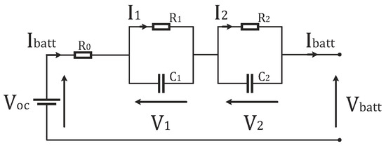 According to [17], the Dual Polarization Electric Equivalent Circuit (ECM) utilized in this work followed the topology of Figure 2, which is a quite accurate approach with low simulation error for the Li-ion electrical characterization purpose [18,19].