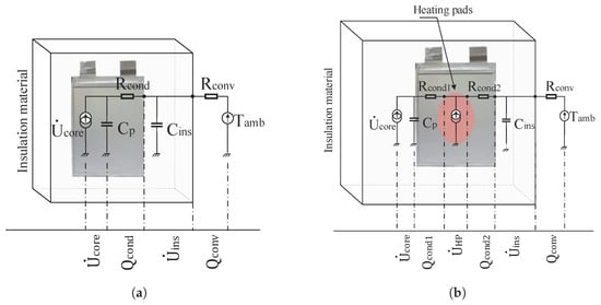 According to Figure 3, the equivalent electrical resistive elements and , along with the capacitive elements and represent the heat transfer phenomena, whereas the current sources represent the rate of heat that is generated or consumed. For the NMC cell, the thermal properties can be found in [13], and they are illustrated in Table 2, along with the thermal properties of heating pad and the insulation material, for convenience.