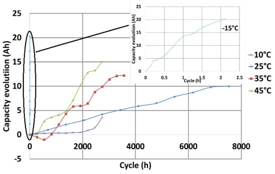 The lifetime model of the pouch cell was developed using an empirical approach. The cycling aging data had been acquired in a previous study, which proposed an extensive battery model for NMC cells. A detailed behavior of the NMC pouch cell of this work for various calendar and cycling aging profiles, as well as the internal resistance increment and capacity fade, are analyzed in [26,27], respectively. The text matrix presented a large number of variables such as depth of discharge, current rate, mid-SOC and temperature. To simplify this study and because of its significant impact on aging evolution, only the temperature dependency has been chosen. The aging model proposed in [27] combines the two aging behaviors of the NMC cell and derives a combined capacity fade behavior model, which is employed in this work and presented in Figure 4 for various temperatures.