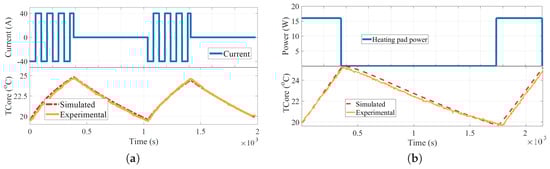 Internal heating temperature behavior and Joule losses on the NMC core at C ambient temperature and for two different cases: temperature window (a) C to C; and temperature window (b) C to C.