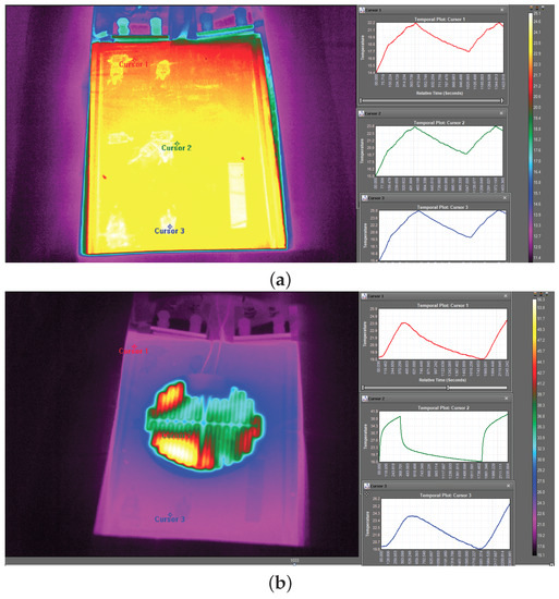 The ambient temperature is set at C and the battery cell is charged with 1C until its core temperature reaches a certain value (C) that is within its optimal temperature range and considered as the upper limit of the selected temperature preservation window. Then, both preheat methods are applied and the battery cell’s core temperature is tracked through an infrared camera. The battery cell is placed inside a climatic chamber to reproduce the cold climate conditions, and an ACT 0550 (80 channels) battery tester charger station is used to produce the bi-directional current pulses. Figure 5 presents both results.